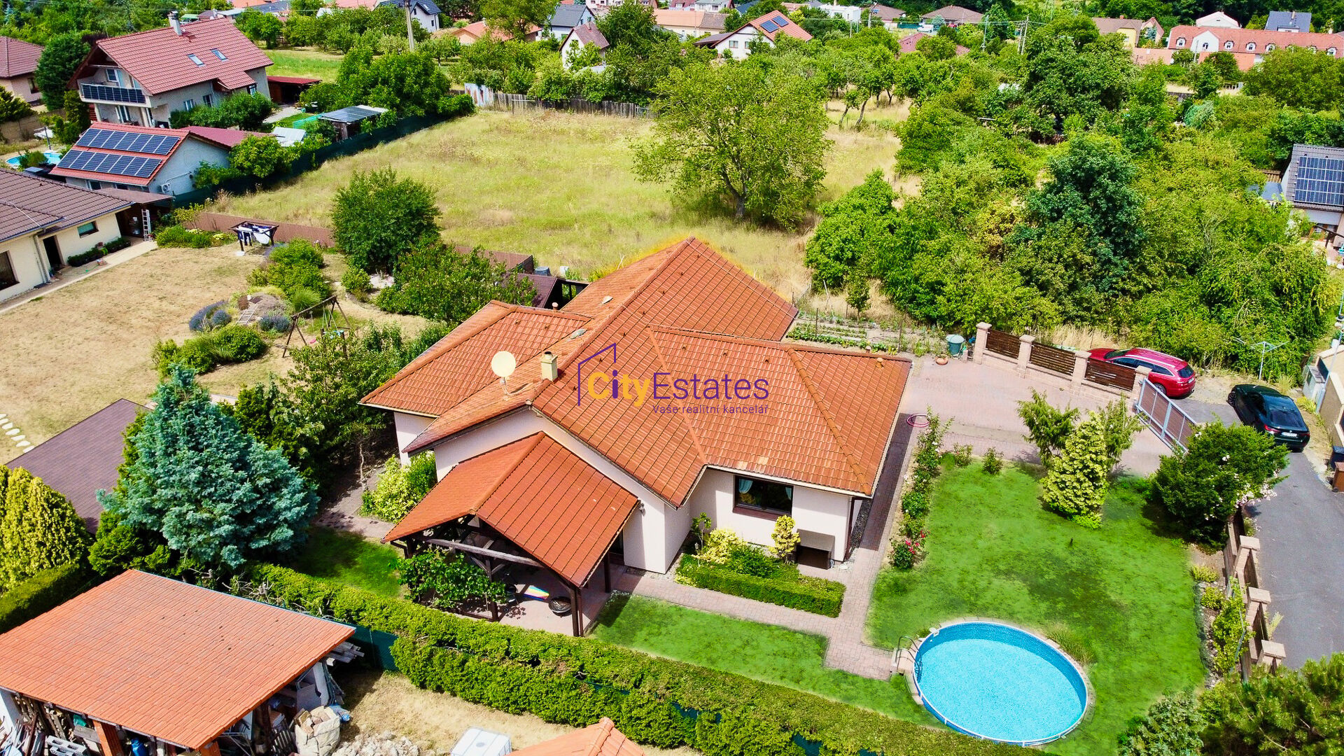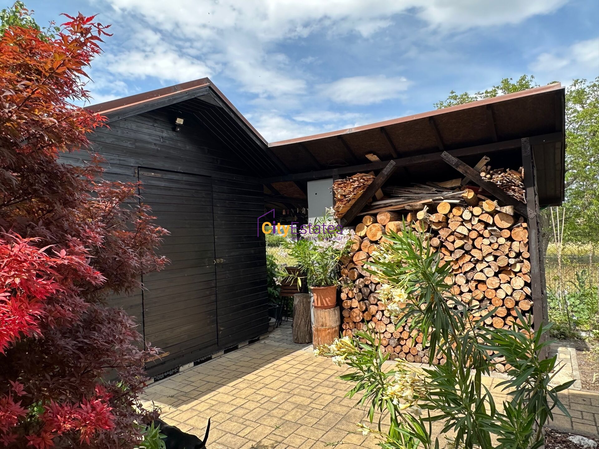 Na zahradě je umístěn bazén s objemem 15 m3, vzadu za domem je postavený sklad zahradního nábytku, nářadí a dřevník.
