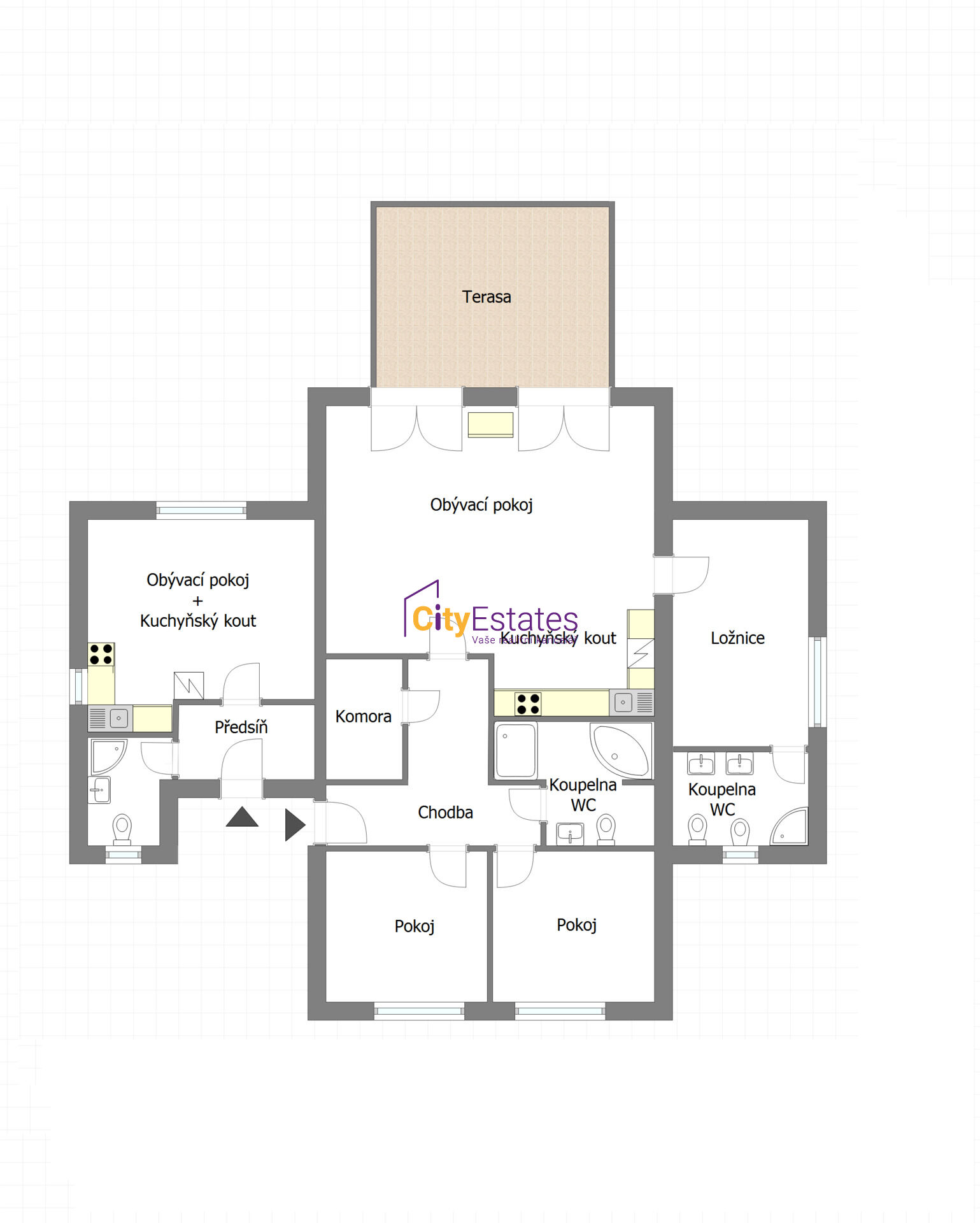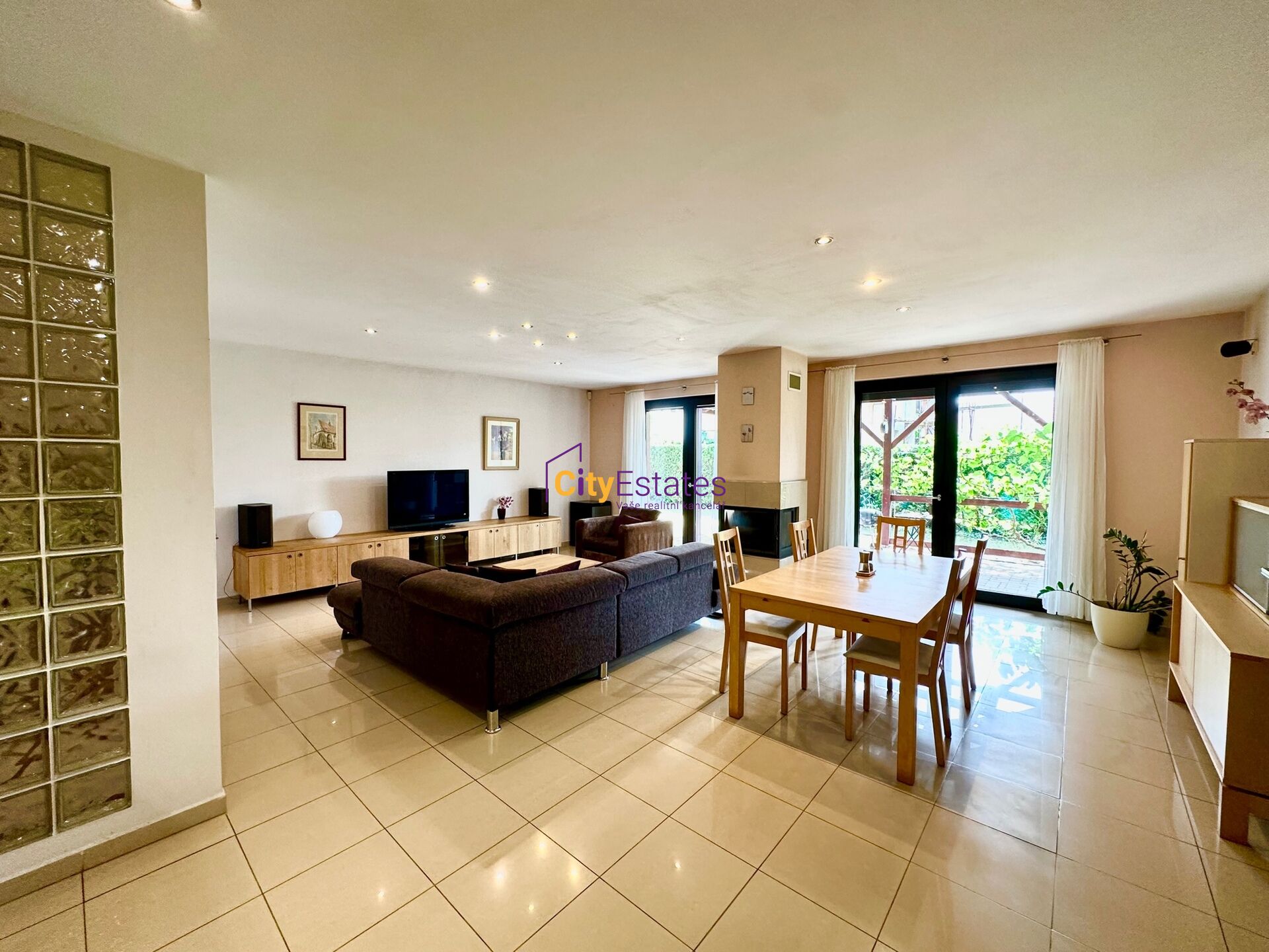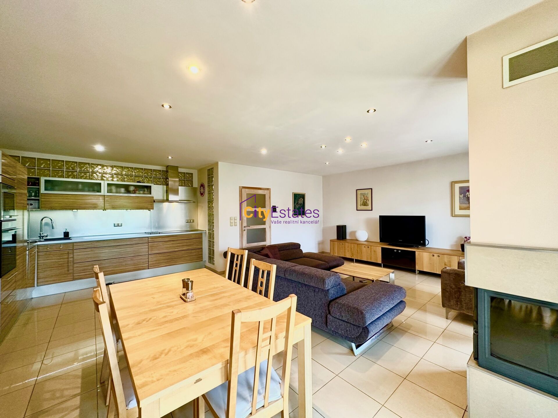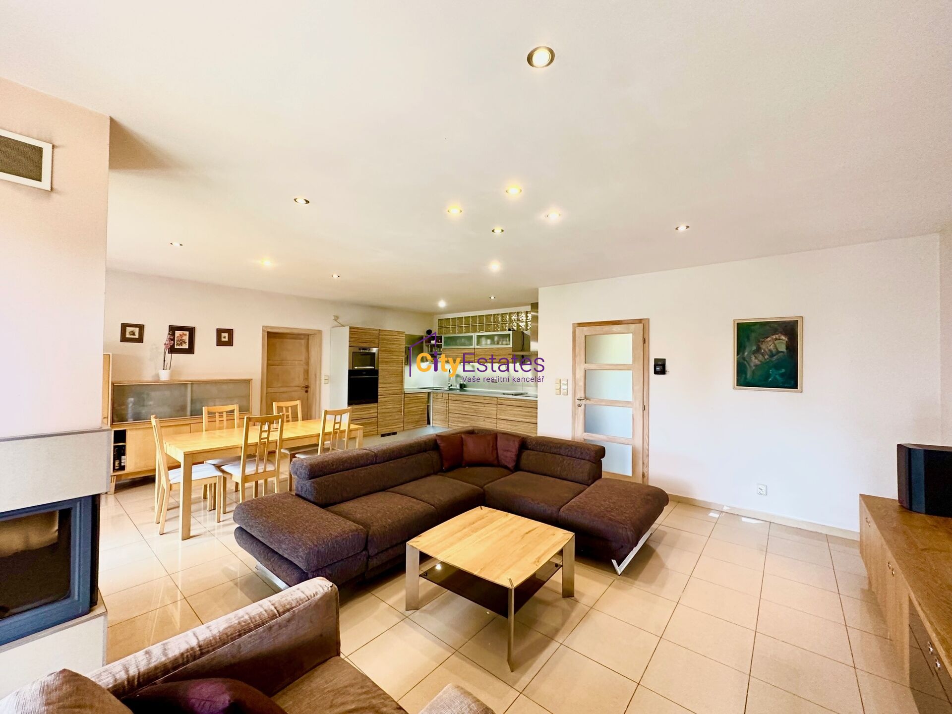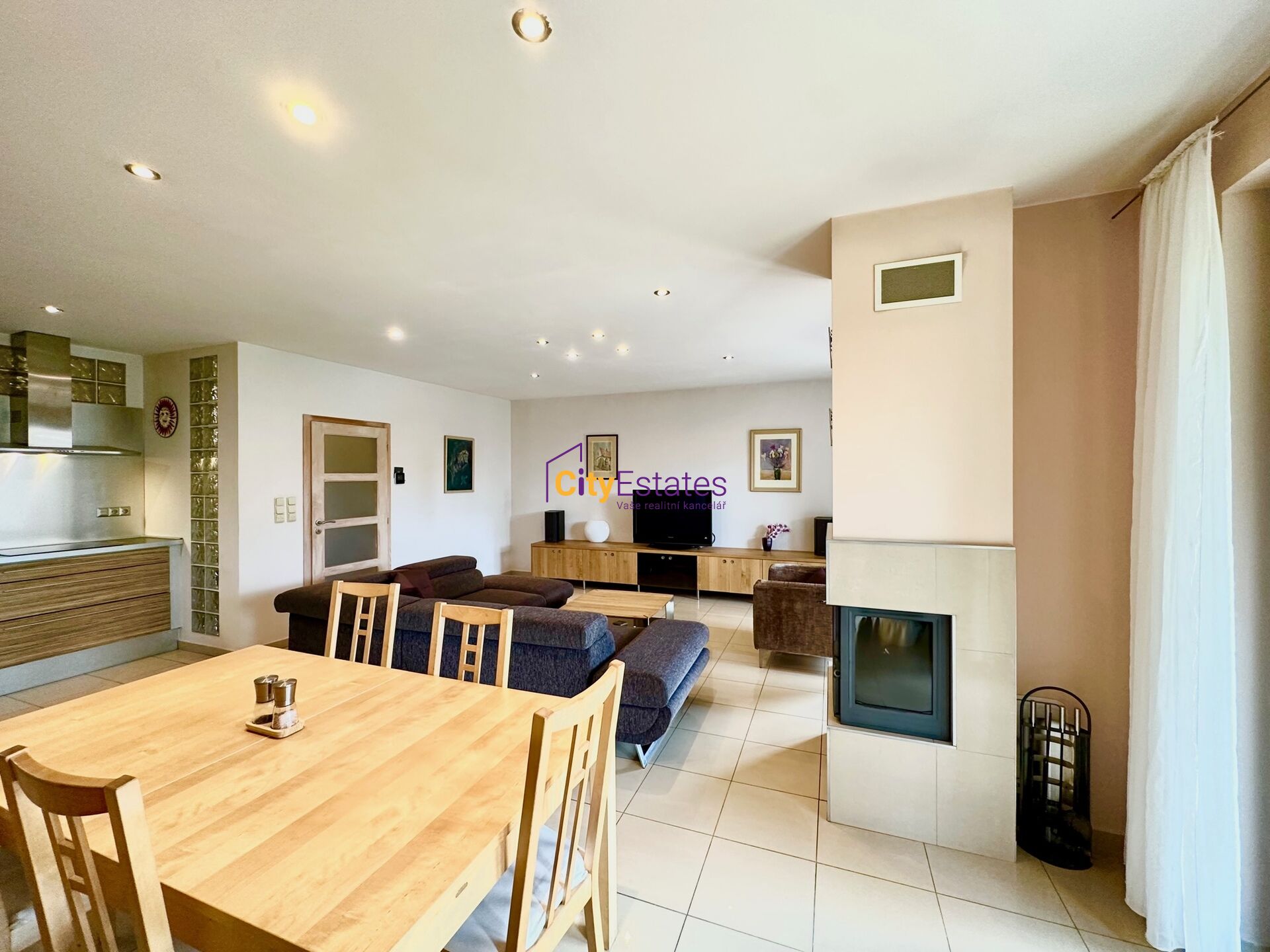 Prostorné 4+kk Vás zaujme svou promyšlenou dispozicí a především velkorysým obývacím pokojem s kuchyňským koutem a jídelní částí (47 m2). Kuchyňský kout je plně vybaven moderními spotřebiči, jídelní část je tak prostorná, že se sem vejde i nadstandartně velký jídelní stůl. Z obývací i jídelní části máte přímé vstupy na velkou zastřešenou terasu, kde můžete trávit letní večery. V obýváku je také vybudován zděný krb se zasklením.