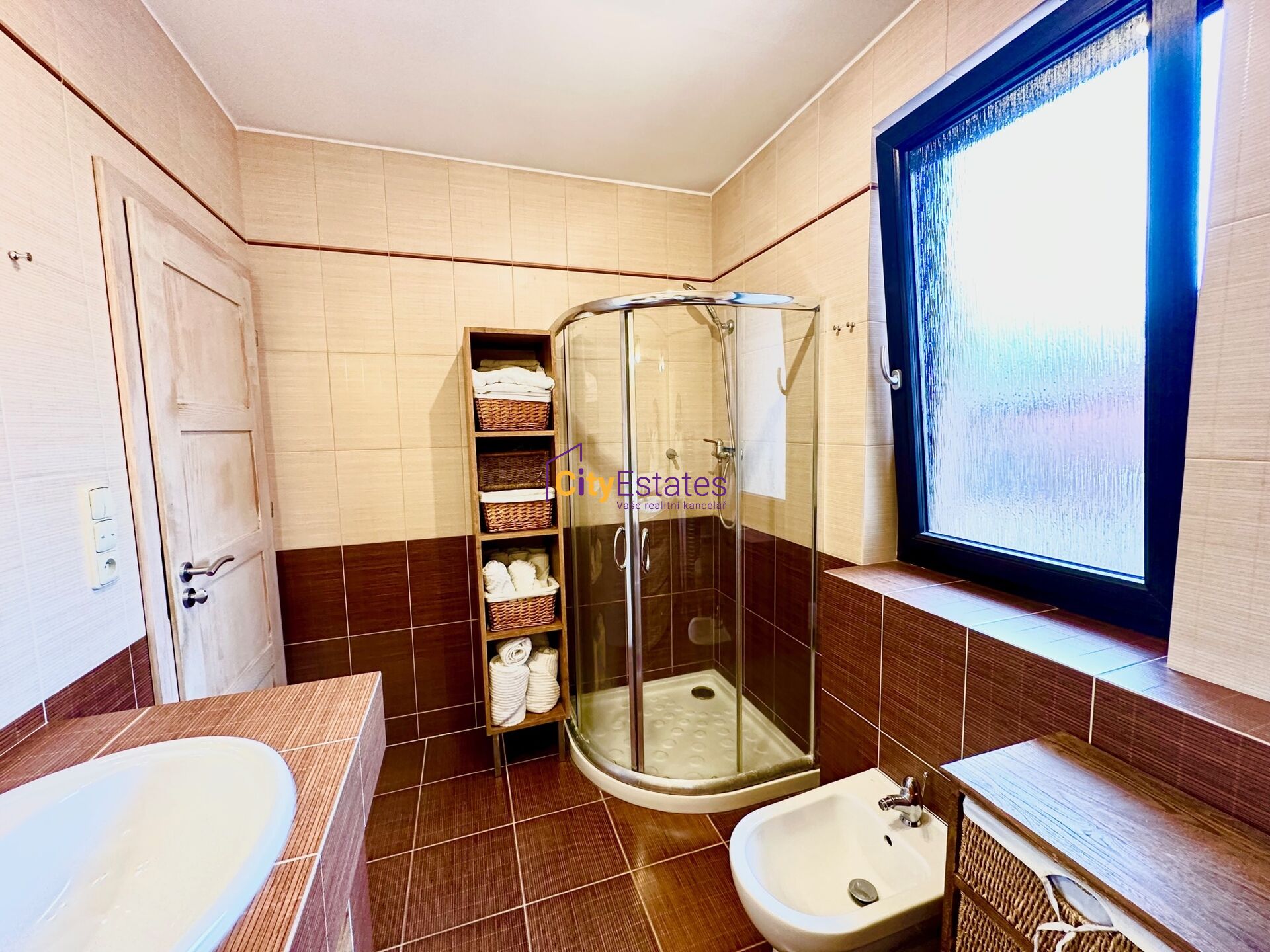 Další dvě ložnice orientované na východ jsou v přední části domu. Zde je také umístěna velká koupelna s vanou a sprchovým koutem, umyvadlem a druhým WC.