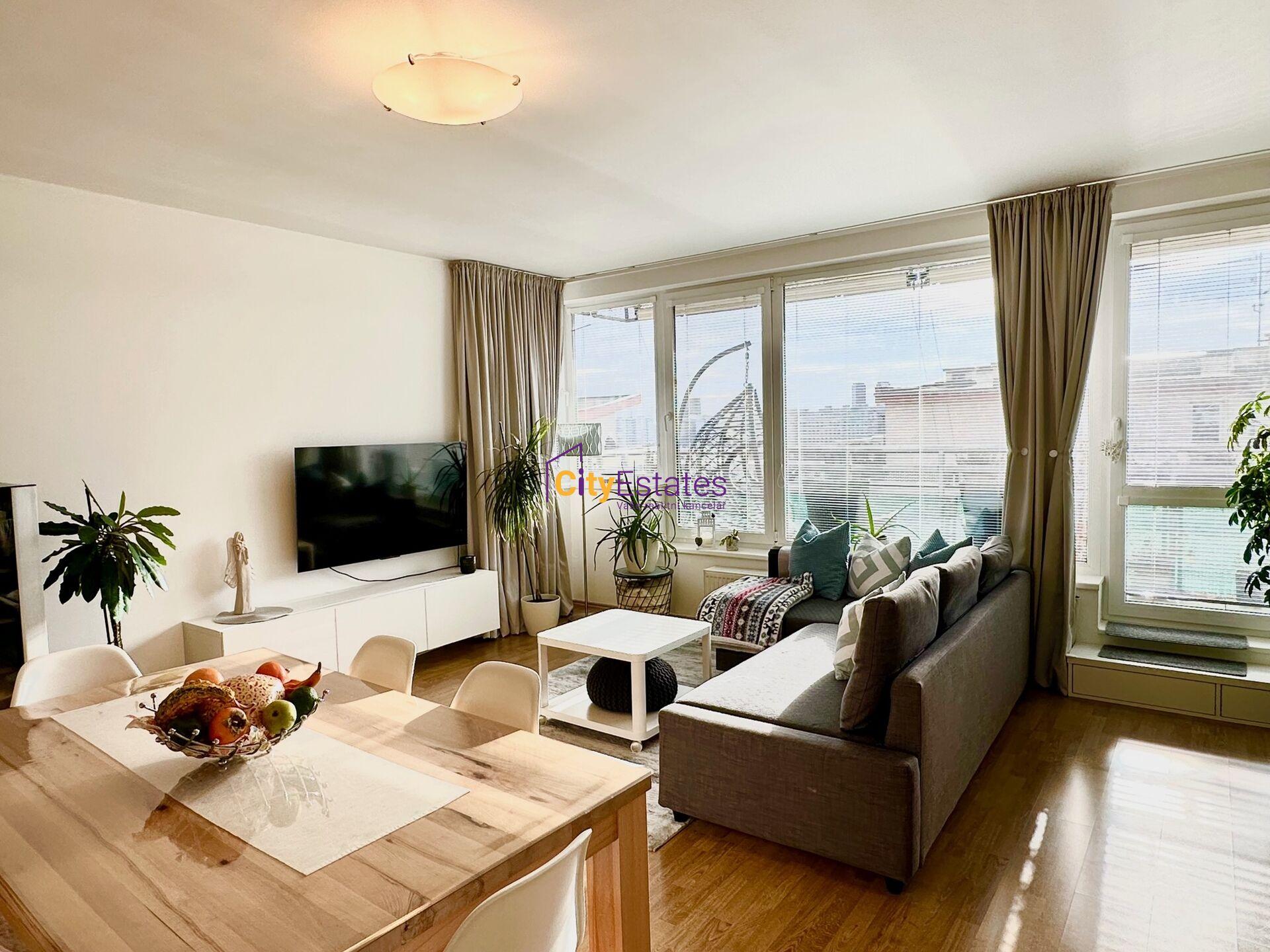 Samotný byt má plochu 99 m2, terasa 10 m2, zasklený balkon 2 m2, sklep 3 m2. Byt je umístěn ve 3. patře cihlového bezbariérového domu s výtahem. Dispozice bytu je velmi dobře řešená. Byt je orientovaný na tři světové strany, z velkého obývacího pokoje s kuchyní vejdete přímo na jižní terasu, tři neprůchozí pokoje jsou orientovány na sever. Jeden pokoj a obývák mají atypické rohové okno. U pracovny je umístěn zasklený balkón. V prostorné koupelně je okno a je zde umístěna rohová vana. WC je samostatné. V bytě je také velmi praktická komora s úložným prostorem. V suterénu domu je zabezpečený sklep a garážové stání.