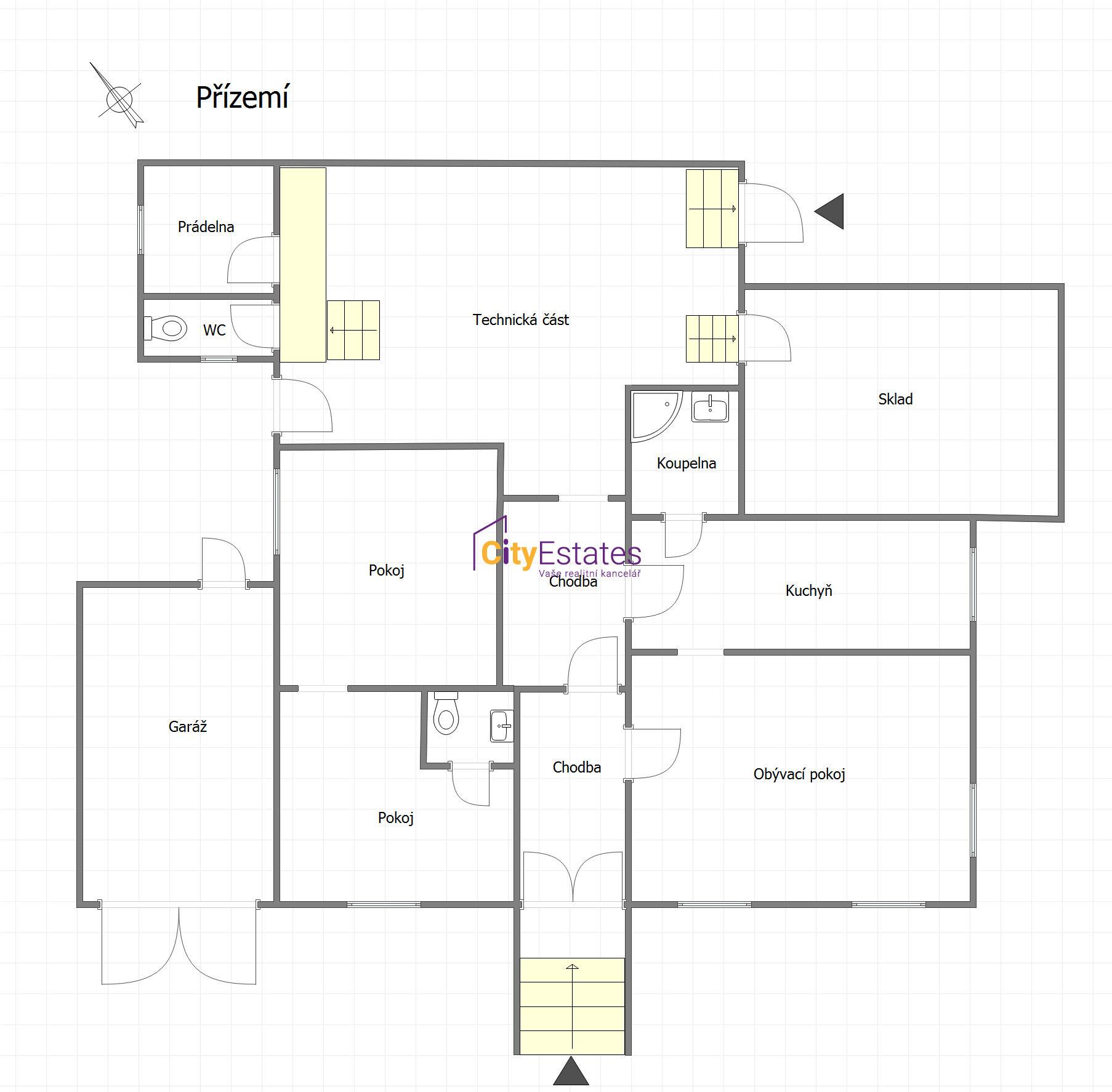 Do domu jsou dva vchody, hlavním vchodem z ulice vejdete do chodby, z níž máte vstupy do privátní části domu se dvěma ložnicemi a WC a na druhé straně se nachází vstup do obývacího pokoje, kuchyně a koupelny. Chodbou vejdete do prostorného technického zázemí domu, kde je další samostatné WC, prádelna, sklady, vstup do sklepa a druhý vstup do domu ze zahrady.